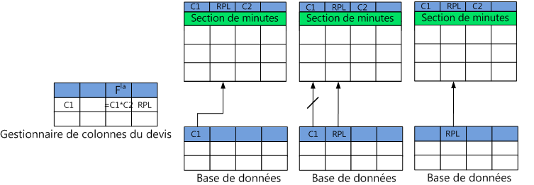 Quand un article ou un ouvrage est inséré dans les minutes, la valeur en base est insérée dans la colonne de remplacement et la colonne initiale reçoit le résultat de la formule si les opérandes existent et ont une valeur.