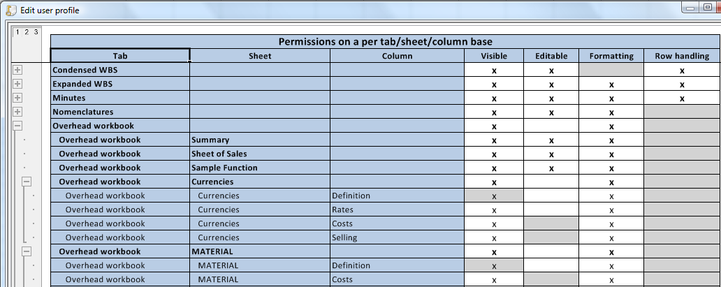▪for users sheets, it governs only the capacity to switch to Edit mode, hence the right to Edit in Excel. (Refer to Locking Cells in a User Overhead Sheet.)