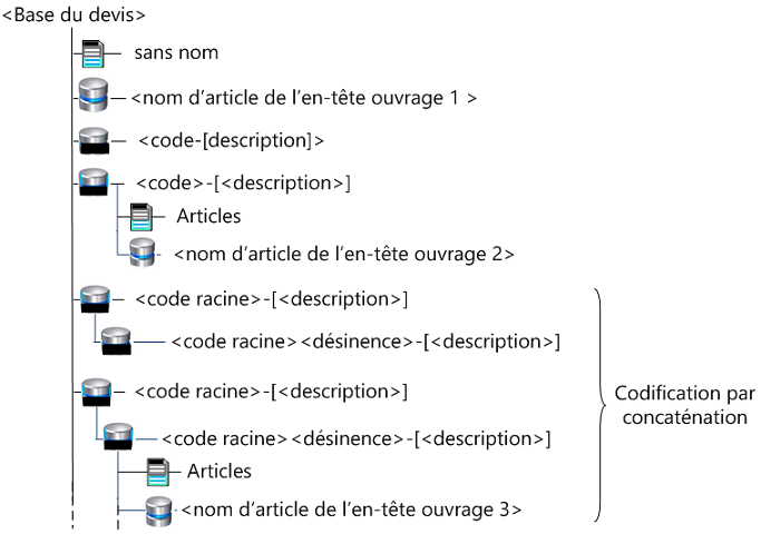 La base du devis peut comporter des ouvrages (par le menu contextuel Créer un ouvrage) et la récursion est autorisée (voir Créer un ouvrage de minutes) :
