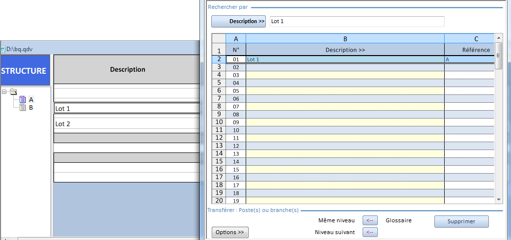 WBS : sélectionner "Même niveau"/"Niveau suivant" ← Glossaire : TOUTE l'entrée (y compris les autres champs) se colle dans le WBS SOUS le poste sélectionné (avec "niveau suivant", le chapitre est divisé) ; cliquer sur Numérotation>Numéroter le devis entier ou la branche courante.