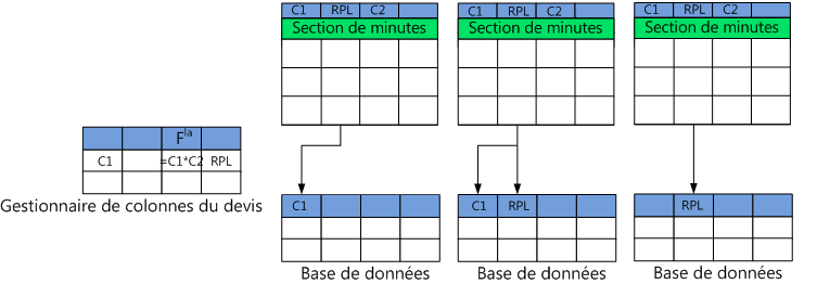 Quand un article ou un ouvrage est inséré dans les minutes, la valeur en base est insérée dans la colonne de remplacement et la colonne initiale reçoit le résultat de la formule si les opérandes existent et ont une valeur.